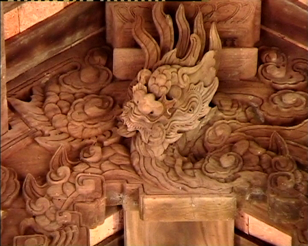 Trang trí trên kiến trúc gỗ, đề tài được thể hiện ở đây cũng xoay quanh những mô típ quen thuộc như: “Tứ Linh”, “Tứ Quý” nhưng bằng sự bố trí các mảng một cách hài hòa cân đối, toát lên vẻ sinh động thu hút người xem.