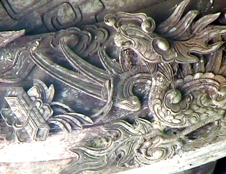Đặc biệt trên tất cả các kẻ của bái đình đều được chạm khắc hai mặt với đề tài xen kẻ như: “Phượng hàm thư”, “Cá chép hóa rồng, “Tùng lộc”, “Rồng chầu nguyệt”... và hình tượng “Long vân” cũng là đề tài được thể hiện nhiều trên các xà, đầu dư, đuôi bẩy của đình với tài nghệ điêu khắc đã được cảm giác như đang thấy rồng ẩn hiện trong mây.