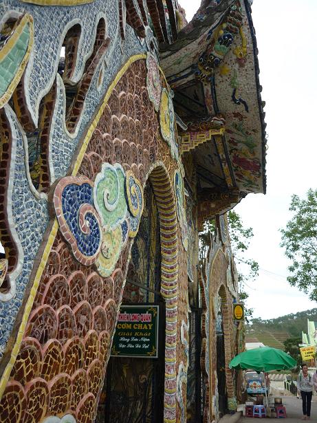 | Chùa Linh Phước ngoài lối kiến trúc độc đáo, toàn bộ ngôi chùa còn được khảm bằng mảnh sành. |